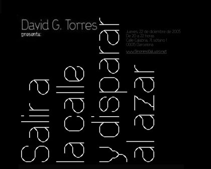 Torres Presenta: "Salir a la calle y disparar al azar" Jueves, 22 de diciembre de 2005 de 20 a 22 h. Calle Calabria, 71, sótano 1 08015 Barcelona |